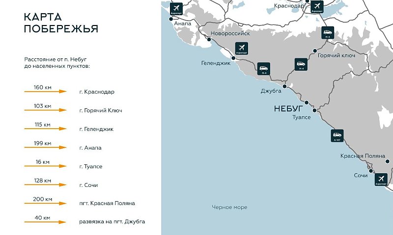 ЖК Ботаника Хиллс расположен в Небуге, это поселок в Туапсинском районе Краснодарского края, который находится между Геленджиком и Сочи. В 17 км от Небуга расположен Ж/Д вокзал в Туапсе. Электричка Ласточка из Туапсе довезет вас до Сочи за 1 ч 43 мин, откуда вы можете улететь на самолете в любом направлении. Также вы можете уехать в аэропорт Краснодара, который расположен в 160 км.